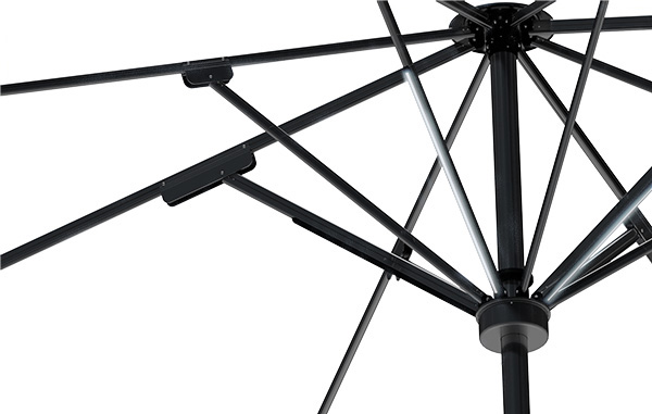TORR-parasols maken gebruik van een revolutionair luifelsysteem, waarbij individuele driehoekige secties in het profiel van de ribben schuiven en vergrendelen.